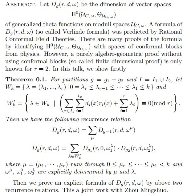 院长,主要从事代数几何的研究,研究方向为模空间理论,包括曲线上向量丛模空间的退化等。2000年获得国家杰出青年基金资助,2012年获国家自然科学奖二等奖,2013年获第十四届陈省身数学奖。主要学术成绩包括:发现并证明 Frobenius同态与稳定向量丛之间的重要联系;证明任意秩广义theta函数的分解定理和Seshadri-Nagaraj猜想;证明模空间极小有理曲线与Hecke曲线的等价性;与人合作证明Gieseker关于平展基本群与D-模关系的猜想等。