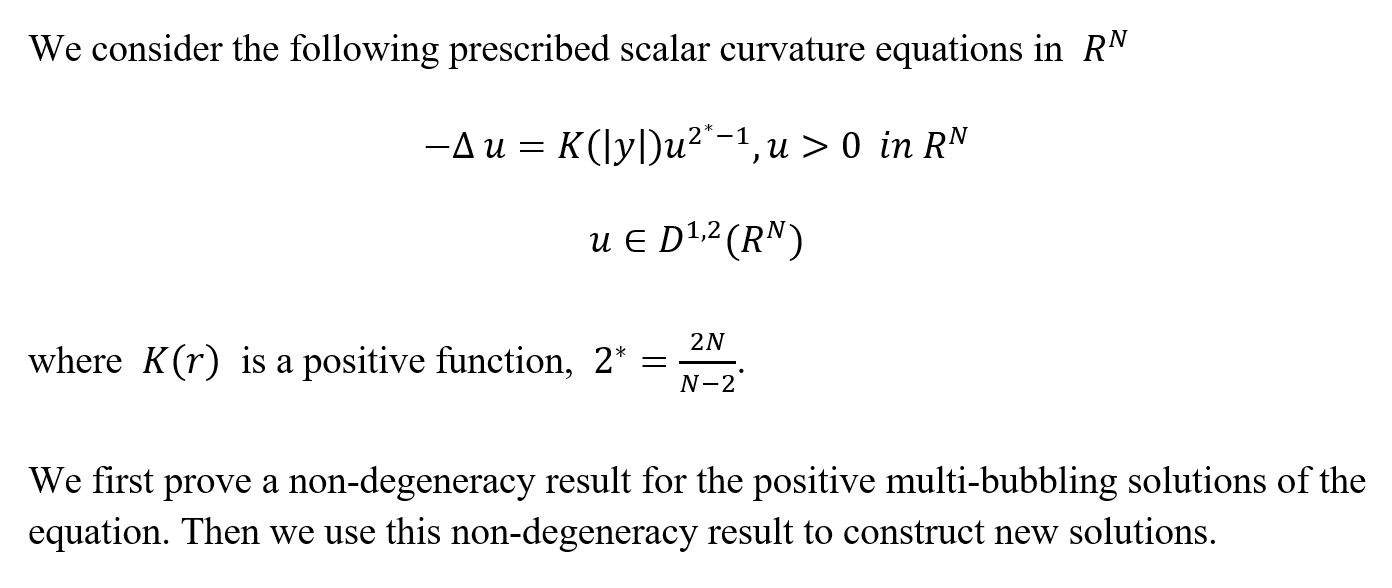 报告题目:Non-degeneracy of Multiple Bubbling Solution for Prescribed Curvature Equation and it’s Applications