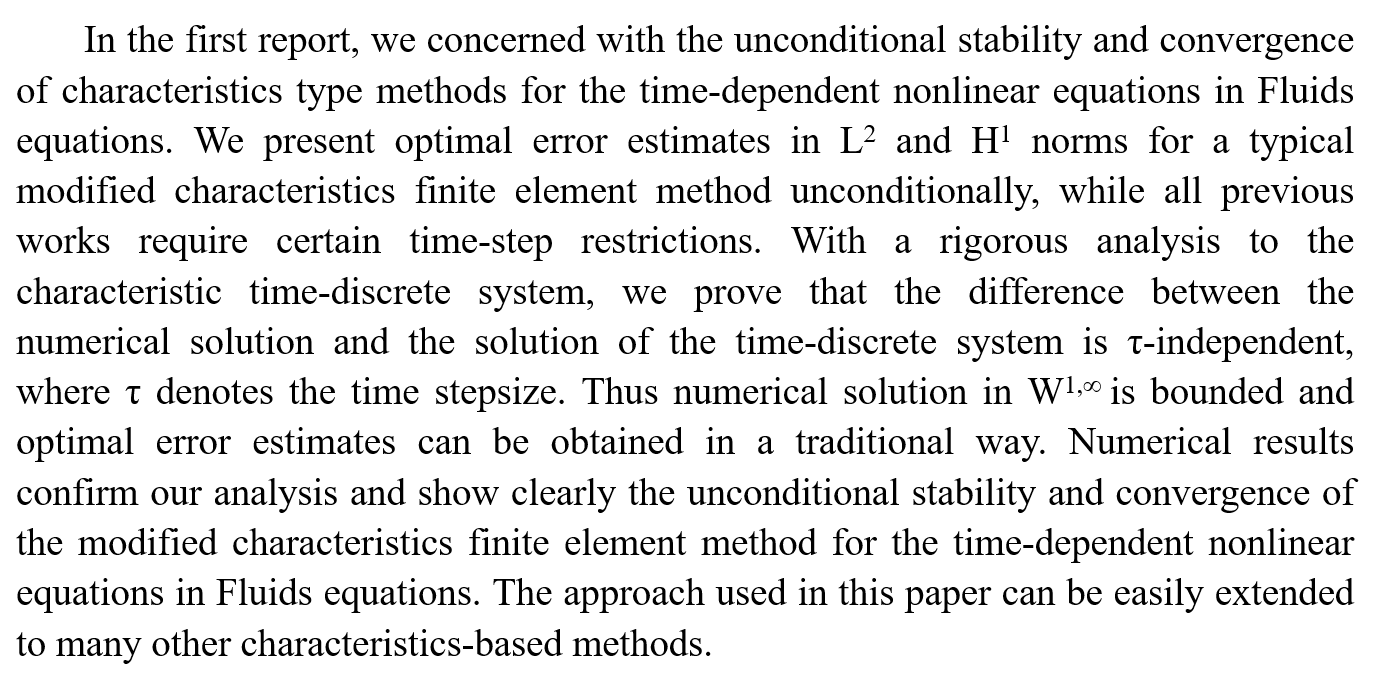 报告题目:Unconditional Stability and Error Estimates of Modified Characteristics FEMs of the Nonlinear Equations in Fluids