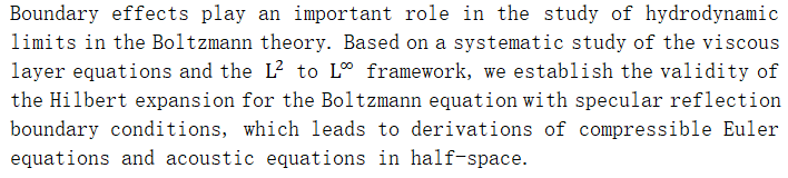 报告题目:Hilbert Expansion of the Boltzmann Equation with Specular Boundary Condition in Half-Space