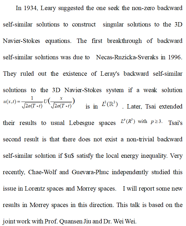 报告题目:Leray's Backward Self-similar Solutions to the 3D Navier-Stokes Equations in Morrey Spaces