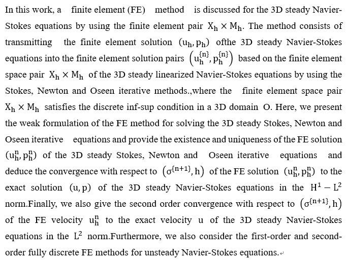 二级教授,博士生导师,享受政府津贴专家,新疆大学“天山学者”讲座教授。曾担任陕西省计算数学学会理事长,陕西省数学学会常务理事,全国计算数学学会常务理事等。长期从事有关N-S方程组, MHD方程组及海洋流体动力学模型的有限元方法的理论和算法研究。连续主持国家自然科学基金7项,部分研究成果获2007年“国家自然科学奖二等奖”(第五完成人),2011年“教育部自然科学奖二等奖”(独立完成),2016年“陕西省科学技术奖一等奖”(第一完成人)。 在国内外杂志发表SCI文章240篇,在SIAM J. Numer Anal, SIAM J. Sci Comp, Numer Math, Math Comp, J Comp. Phys., Comput Methods Appl Mech Engrg,IMA J. Numer Analysis, Int J. Numer Methods Engrg等计算数学类期刊上发表文章31篇。