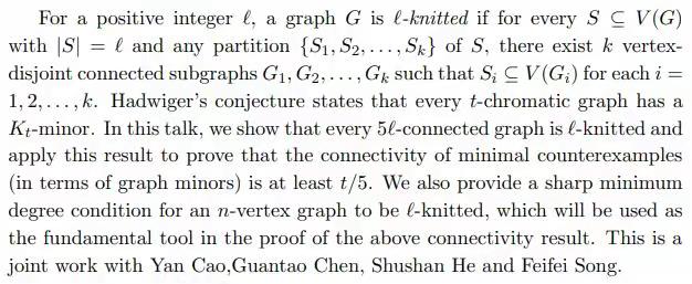 报告题目:Graph Knitting: Minimum Degree, Connectivity and Hadwiger’s Conjecture