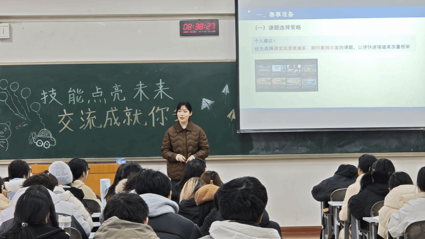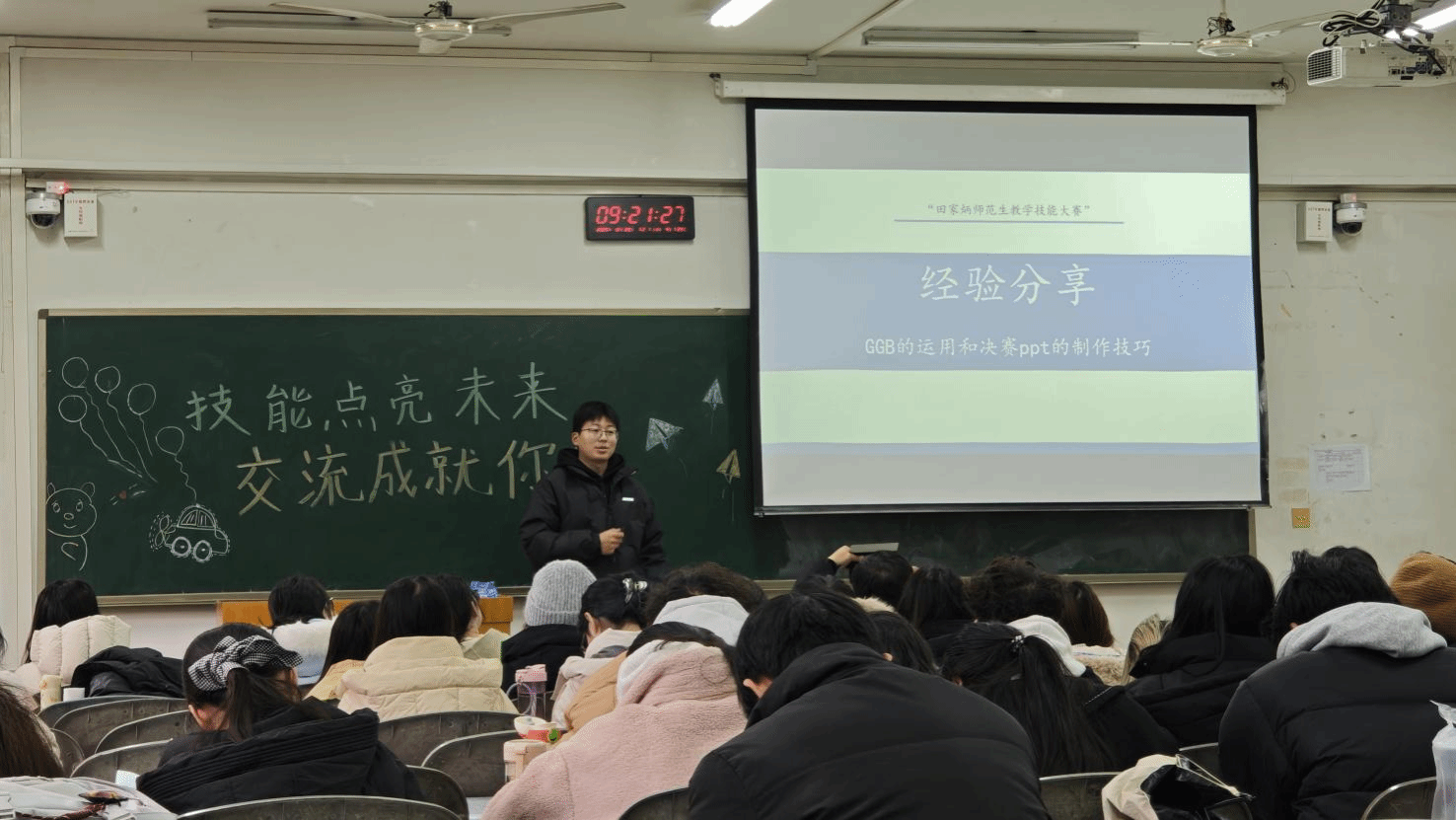 吴梓萌、王园、孙梦岩、孙驰等四位在2025年全国“田家炳杯”全日制教育硕士教学技能大赛中斩获佳绩的同学,聚焦赛事的核心内容,从赛事流程与整体认知、各阶段备赛策略、赛程心态引导、专业技能与工具应用四大板块进行系统讲述,为在场师生提供了实用且全面的备赛指南。