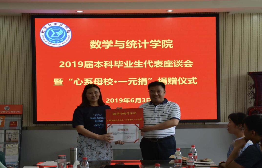 党办主任、2019届毕业生辅导员狄丽娜颁发了捐赠纪念证书,随后介绍了“心系母校·一元捐”活动的建立初衷。他表示,学校举办“心系母校·一元捐”活动主要目的是在于培养河大学子的感恩情怀,所捐款项将全部用于资助在校困难学生,以帮助他们顺利完成学业。他祝福毕业生们前程似锦,希望大家不忘母校,不忘师恩,将来能够回馈社会,报效国家。