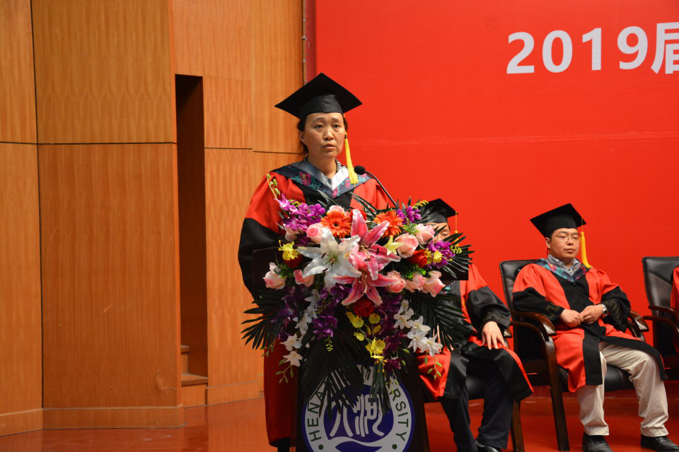 韩莹作为毕业生代表首先发言,她满怀深情地讲述四年的校园生活与感悟,表达着对师生情的感恩与对同学情的留恋。她表示:我们一定秉承“明德新民,止于至善”的校训,勇于担当,用我们的所学、所长,为这个社会谱写更动听的乐章,用我们的努力与成功回报社会,回报母校。