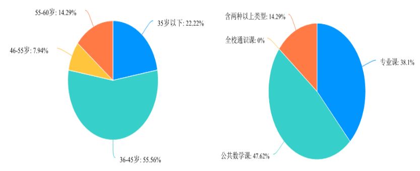 本次调查收到任课教师有效问卷63份,其中45岁以下教师占77.8%。任课教师讲授的课程类型中,38.1%为专业课,47.62%是公共数学课,同时任教两种类型的占14.29%。