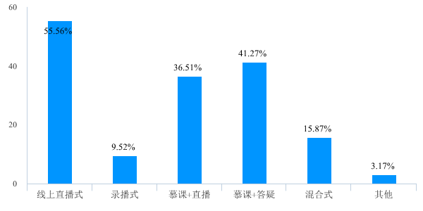 对于教学方式的选择方面(多选题),选择线上直播式的老师占55.56%,选择慕课加直播或者混合式占52.38%,选择慕课答疑的占41.27%,其他方式的占3.17%。说明大多数老师选择的是线上直播,随着鱼虾蟹游戏