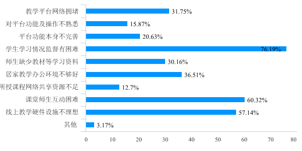 为了进一步了解老师们在线上教学中遇到的困难,本次调查还专门对这一情况进行了调查。老师们集中反映的线上教学的困难主要集中在:1)学生学习情况监管困难;2)课堂师生互动困难;3)教学硬件设施不理想;4)居家办公环境不够好;5)平台网路拥堵;6)师生缺少教材等学习资料。