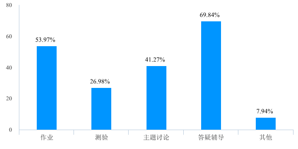 师生互动也是教学效果好坏的一个重要影响因素,从师生互动方式调查数据来看,由于数学类课程的特点,老师们采用最多的互动方式是答疑辅导,达69.84%。作业、主题讨论和测验也占据了较大的比例,说明线上教学中师生高度重视教学互动环节。