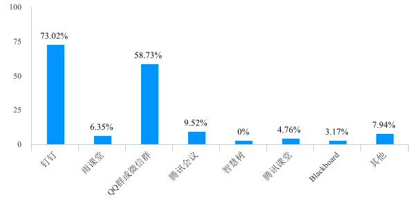 在线上平台选择方面(多选题),选择钉钉教学平台的比例最高,达73.02%;其次是QQ群或者微信群;也有少量老师选择其他教学平台。