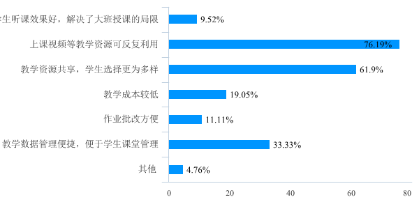 老师平时教学中基本都采用传统的课堂板书教学,普遍对线上教学经验缺乏,通过这一段时间线上教学的开展,广大任课教师体会到线上教学也具有不少的优势,其中优势主要体现以下几个方面:1)上课视频等教学资源可反复利用,便于学生课后自学;2)教学资源可共享,学生选择更为多样;3)教学数据管理便捷,便于课堂管理;4)作业批改方便;5)能解决了大班授课的局限问题等。
