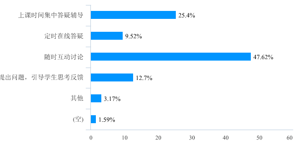 线上教学的辅导方式也呈现出多样化的特点,其中随时互动讨论模式的占比最高,达47.62%,其中上课集中答疑和引导学生思考的模式也占据较大比例。