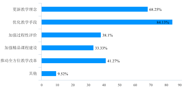 对于线上教学给大家今后教学工作带来促进作用方面,绝大部分任课老师认为线上教学能促进大家进一步优化教学手段,更新教学观念,强化课程教学过程性评价。同时在推动精品课程建设和全方位教学改革方面都有积极的促进作用。