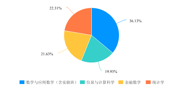 开设的四个本科专业,其中数学与应用数学专业(含明德计划实验班)占36.13%,信息与计算科学专业占19.93%,金融数学专业占21.63%,统计学专业学生占22.31%。