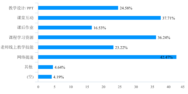 学生平时更多接受的是传统课堂教学,对线上教学接触相对较少。从同学们对于线上教学认可度的调查数据看,对于线上教学特别感兴趣的仅占9.51%,较为感兴趣占34.88%,兴趣一般的占47.68%,说明学生对于线上教学方式的认可和接受还有一个较长的过渡过程。