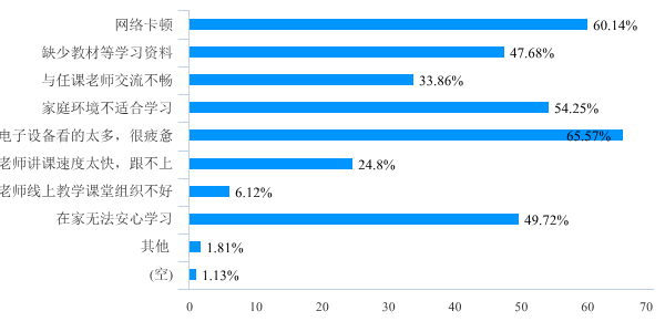 同学们认为居家线上学习的困难主要集中在:1)电子设备看的太多,很疲惫;2)网络卡顿;3)家庭环境不适合学习;4)在家无法安心学习;5)缺少教材等学习资料;6)与任课老师交流不畅;7)老师讲课速度偏快。