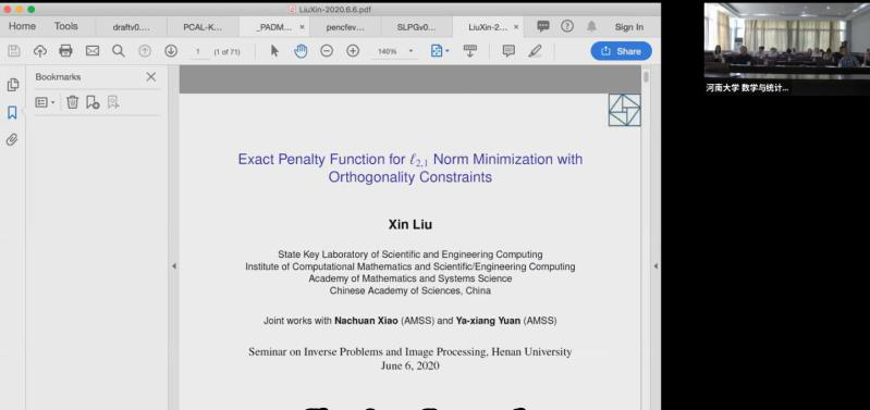 主办的“2020河南大学反问题与图像处理线上研讨会”成功举行。来自香港浸会大学、中科院数学与系统科学研究院、北京大学、复旦大学、南京大学、东南大学、哈尔滨工业大学、北京航空航天大学、南方科技大学、华东理工大学等境内外高校和科研院所的十一位专家学者出席研讨会并报告了各自最新研究成果。