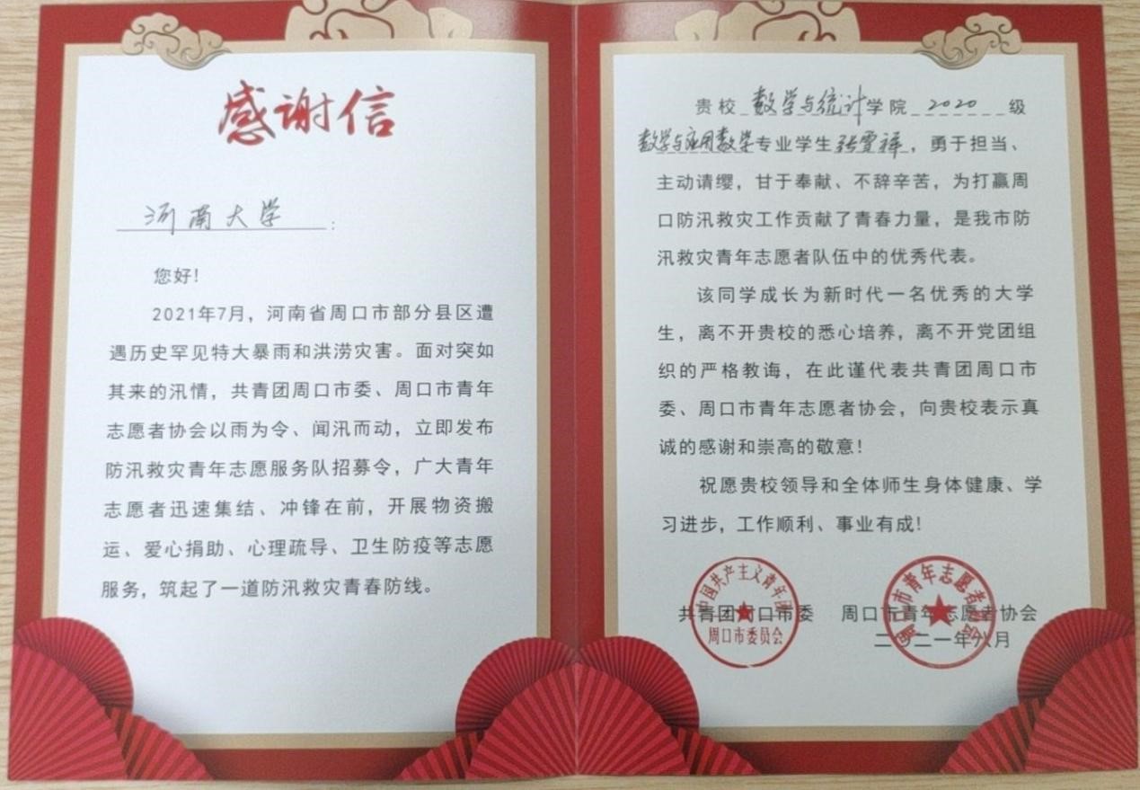 张雪祥同学在汛期郑州泄洪时,主动协助周口当地的蓝天救援队开展巡河,查看水位情况等工作,并协助搬运发放全国各地的物资(食物以及水源)到周口受灾严重的地方(西华,扶沟),为抗洪救灾贡献了自己的力量。