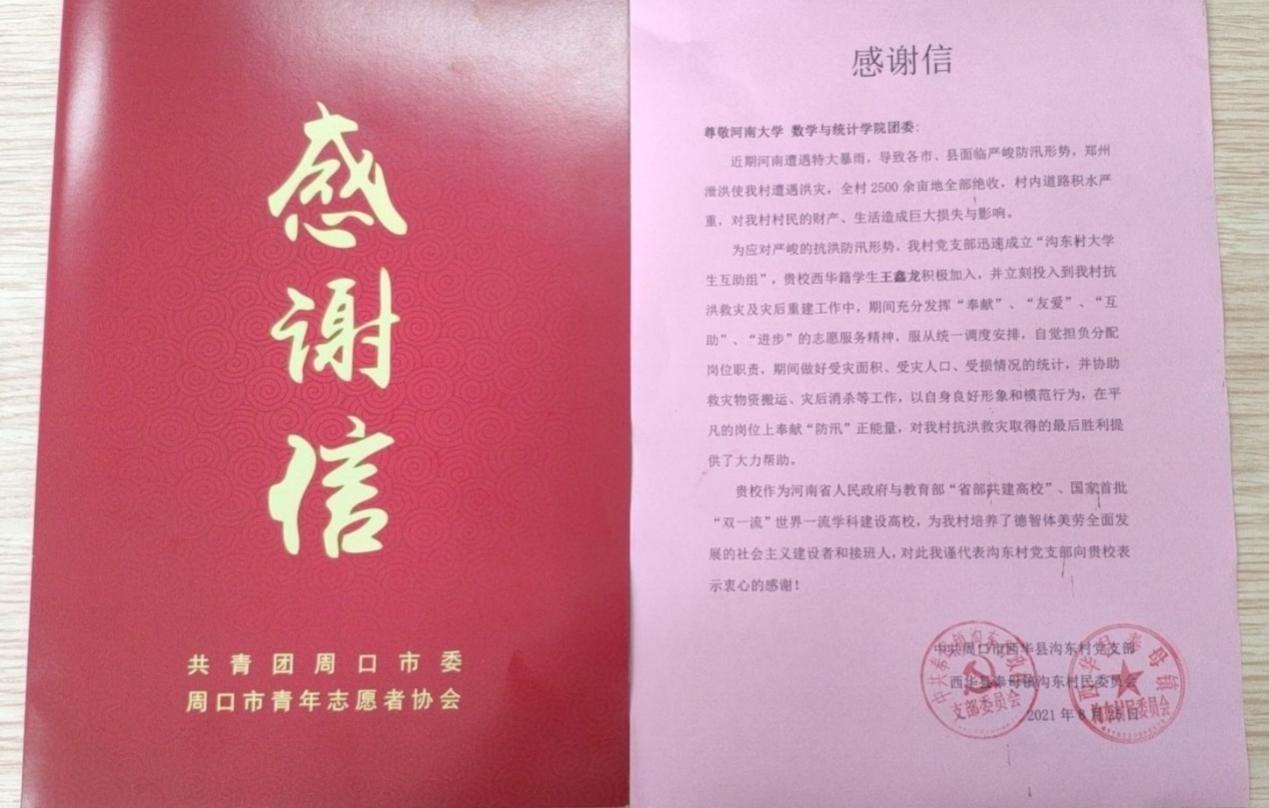 王鑫龙同学在汛期抗洪救灾中主要负责排查外出居家人数,登记手机身份证银行卡等个人物品信息,协助统计并发放受灾生活补助及物资,实地调查受灾耕地情况和面积等工作,共计志愿服务约两周时间,为今夏西华县沟东村的抗洪救灾工作做出了很大贡献。