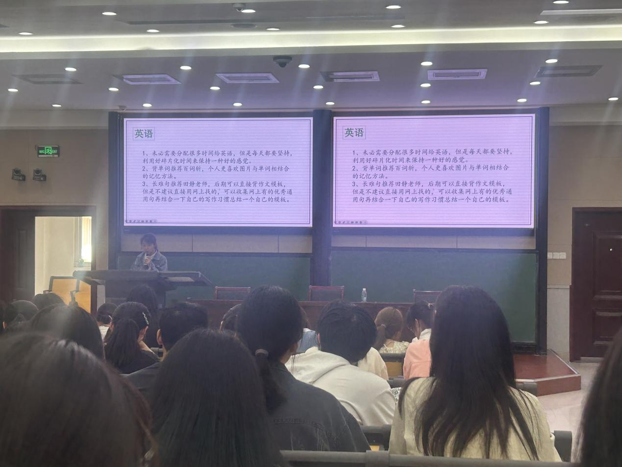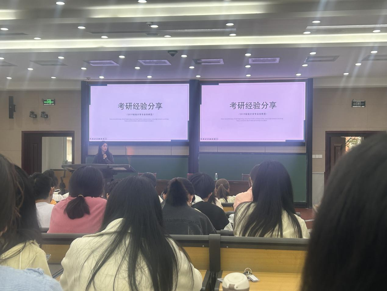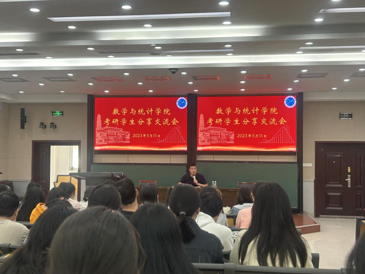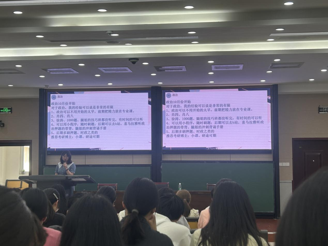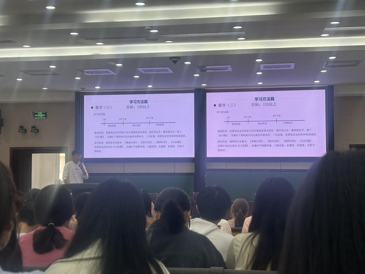 分享会上,10位优秀学长学姐依次做了经验分享。数学与应用数学实验班崔嘉成,考研至华东师范大学,他介绍了择校标准,分享了自己的备考经验,以及相应考试科目所准备的复习资料,强调了需要坚持,不能放弃;数学与应用数学实验班郑佳依,考研至四川大学,讲述了自己在选择院校时的经验和看法,在专业课的备考上需要提前做好规划,将课本内容吃透,还需要做好复试的充分准备。数学与应用数学专业伊诺,考研至吉林大学,讲述了自身的备考经验,需要珍惜时间,可以每天利用碎片化时间去学习,并提前制定好计划去完成。数学与应用数学专业张玉洁,考研至中国石油大学,讲述了心态的重要性,考研要和自己作比较,提醒大家要多复习对应专业课的课本,基础知识很重要。信息计算科学专业曾靖,考研至上海大学,分享了许多自己考研的书籍资料,以及有用的公众号,提醒学弟学妹们要利用好真题,多刷多总结,清楚自己的复习节奏,不要被别人打乱。信息与计算科学专业方瀚森,考研至河南大学,他谈到,要做自己的生涯规划,确定自己的目标,很多科目可以多背模板,多练习模拟题,以此提高自己的复习效率。金融数学专业席腾浩,考研至大连理工大学,强调了择校的重要性,介绍了自己的学习模式以及学习方法。金融数学专业李勇奇,考研至中央财经大学,介绍了择校技巧,选择城市,解答了选择学硕还是专硕的问题,给学弟学妹们介绍了历年录取情况的重要性,以及对应的学校档次。统计学专业的张雅斐,考研至西南大学,详细地给学弟学妹们介绍了所用的书籍,网课,以及自身计划。统计学专业张晓昱,考研至吉林大学,她介绍了考研时需要先定专业,了解所需考的科目,再选择学校,要做好自己的计划安排。