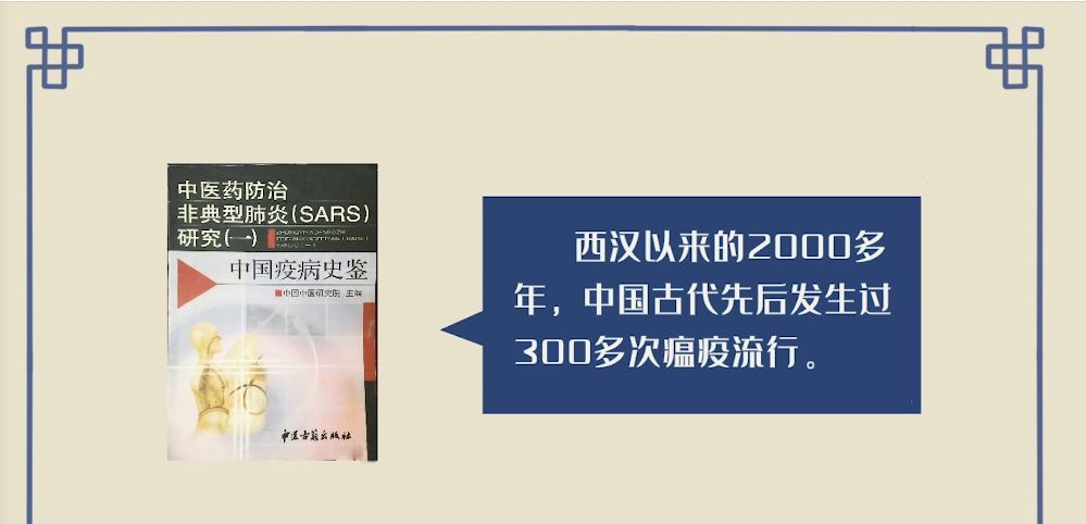 答:《中国疫病史鉴》记载,西汉以来的2000多年,中国古代先后发生过300多次瘟疫流行。但由于中医的预防和治疗,在有限的地域和一定的时间内,控制了瘟疫的蔓延。